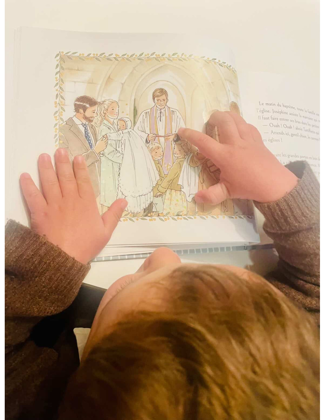 Ce livre à la douce particularité d’inscrire l’évènement du baptême dans un ensemble de petits détails familiaux qui marquent les frères et sœurs : la préparation de la tenue de l’enfant, la confection des faire-part… Puis, dès que l’on tourne la page qui annonce le début de la cérémonie du baptême, l’auteur nous offre comme une pause dans le rythme effréné des préoccupations matérielles… le temps ralentit, la porte de l’église s’ouvre…. L’eau attend, le saint chrême s’impose, la lumière danse … une larme d’émotion tombe aussi discrètement ! En duo, by.bm et Marie Vigneaud font résonner cette foi en Dieu à travers leurs mots et leurs coups de pinceaux. Les dernières pages nous laissent enfin avec ces images d’enfant rayonnant de la lumière de Dieu, sur qui veille désormais un grand saint, chaque jour et chaque nuit !